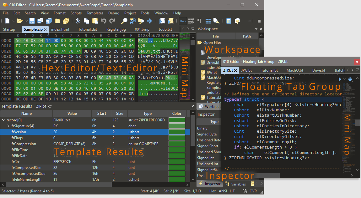 以下截图展示了 010 Editor 的部分强大功能。点击图片可查看高分辨率大图。